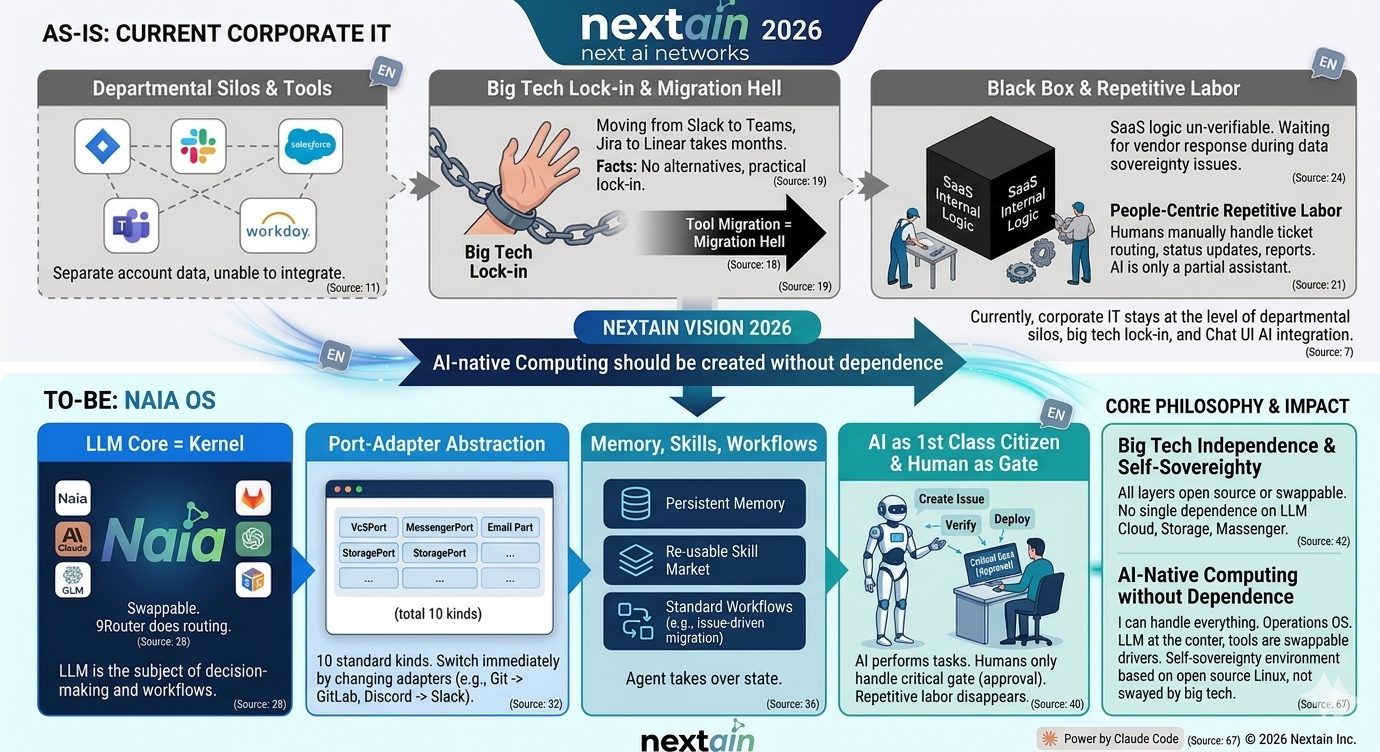 Today's enterprise IT is stuck in departmental silos, Big Tech lock-in, and Chat UI-level AI integration. Nextain builds an AI-native OS based on Port–Adapter abstraction and open source Linux — free from Big Tech dependency.