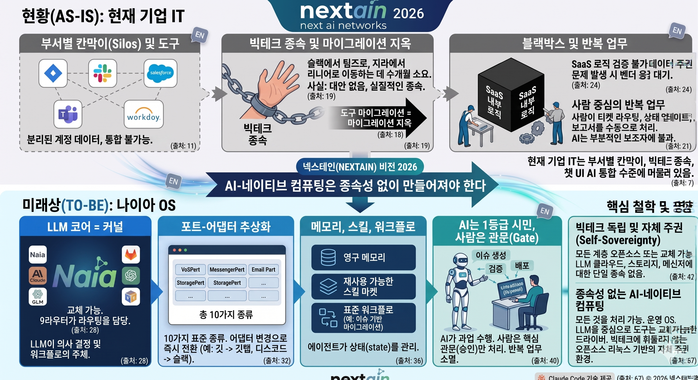 현재 기업 IT는 부서별 사일로, 빅테크 lock-in, Chat UI 수준의 AI 통합에 머물러 있습니다. Nextain은 Port–Adapter 추상화와 open source Linux 기반으로 빅테크에 휘둘리지 않는 AI-native 운영체제를 만듭니다.
